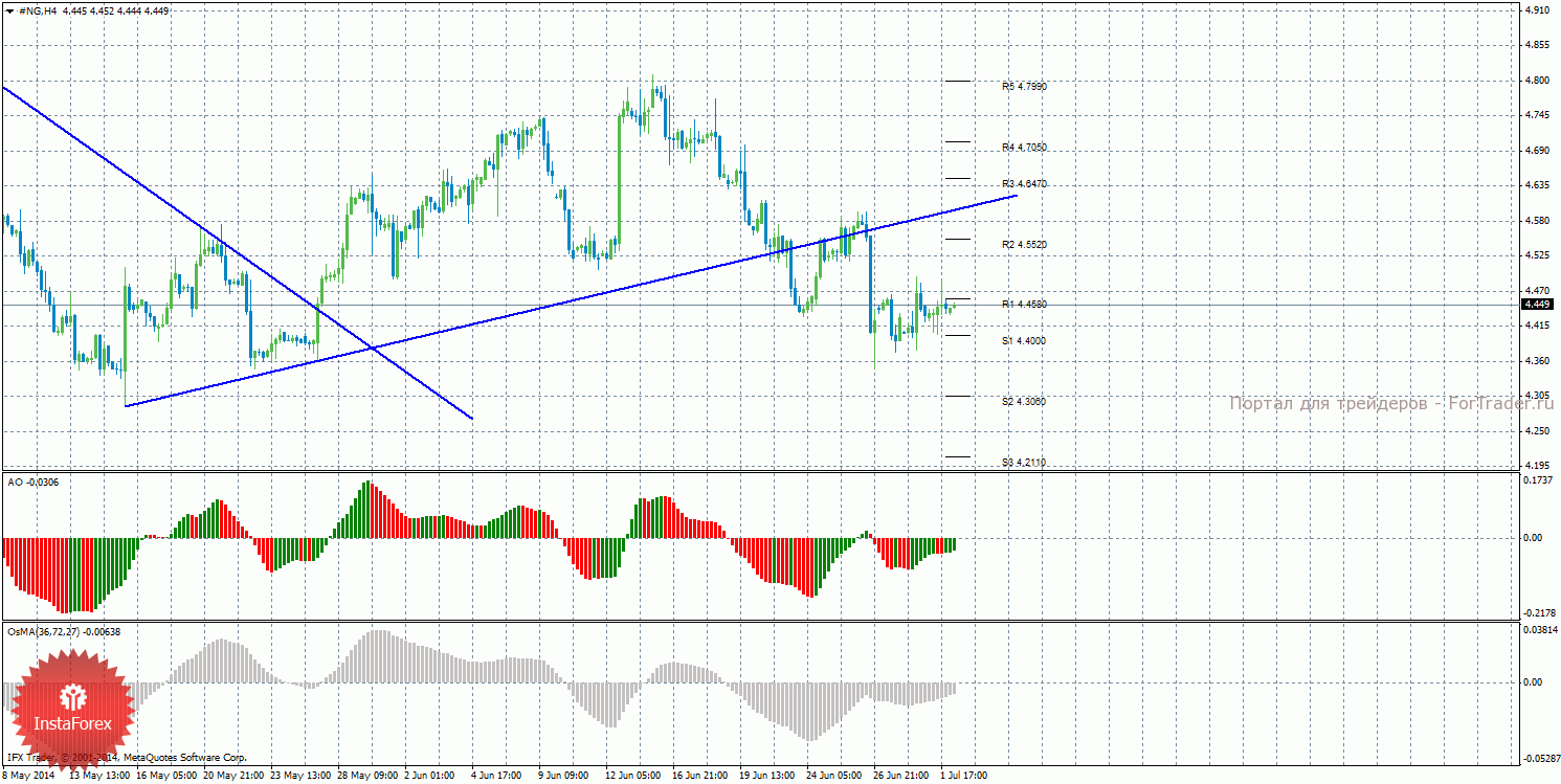 Анализ природного газа за 2 июля показывает, что цена корректируется и не может преодолеть пока что уровень поддержки S1 — 4,4000. На данный момент актуально нисходящее движение с целями уровни поддержки S2 – 4,3060 и S3 – 4,2110, если цена закрепится ниже уровня 4,4000. Целями для начала восходящей коррекции выступают уровни 4,4580 и 4,5520, если цена останется выше уровня 4,4000. Восходящая линия тренда больше не оказывает поддержку торгующим на повышение, цена закрепилась ниже нее, поэтому сейчас являются актуальными короткие позиции. Индикатор Awesome показывает локальное восходящее движение, последний закрытый бар окрашен в зеленый цвет. OsMA также направлен наверх, что сигнализирует о восходящем движении цены на газ и в более долгосрочной перспективе. Закрепление цены выше уровня 4,4580 может спровоцировать продолжение коррекционного движения.