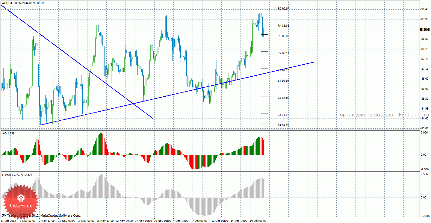 Анализ сырой нефти за 21 декабря показывает, что цена начала корректироваться после того, как почти отработала последний уровень сопротивления R5 — 90,57. Восходящая линия тренда поддерживает быков и выступает поддержкой восходящему движению. Таким образом, сейчас актуальны длинные позиции с целями R4 – 89,63 и R5 – 90,57, но после отскока цены от уровня 89,05. Также возможно возобновление коррекционного движения с целями 88,11 и 87,17, но только в случае закрепления цены ниже уровня 89,05. Индикатор Awesome показывает текущее нисходящее движение, так как последний закрытый бар красного цвета, что говорит о текущей коррекции. OsMA также направлен вниз, что говорит о нисходящем характере движения и в более долгосрочном плане.