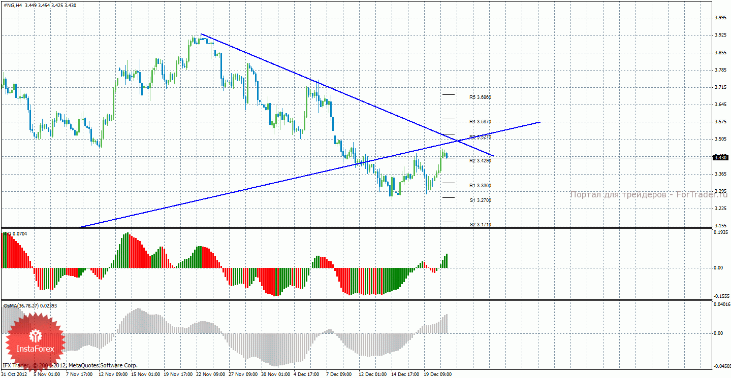 Анализ природного газа за 21 декабря показывает, что цена сохраняет перспективы нисходящего движения, но при этом инструмент вновь начал корректироваться. Cейчас актуально нисходящее движение с целями 3,3300 и 3,2700, но только в случае закрепления цены ниже уровня 3,4290. Целями для начала восходящей коррекции выступают уровни 3,5270 и 3,5870, если цена не закрепиться ниже 3,4290, то коррекция может продолжиться. Восходящая линия тренда больше не поддерживает торгующих на повышение, так как цена закрепилась ниже нее, зато новая нисходящая линия тренда оказывает поддержку медведям. Индикатор Awesome показывает локальное восходящее движение, последний закрытый бар окрашен в зеленый цвет, что свидетельствует о восходящем движении. OsMA также направлен вверх, что сигнализирует о продолжении восходящего движения цены на газ и в более долгосрочной перспективе.