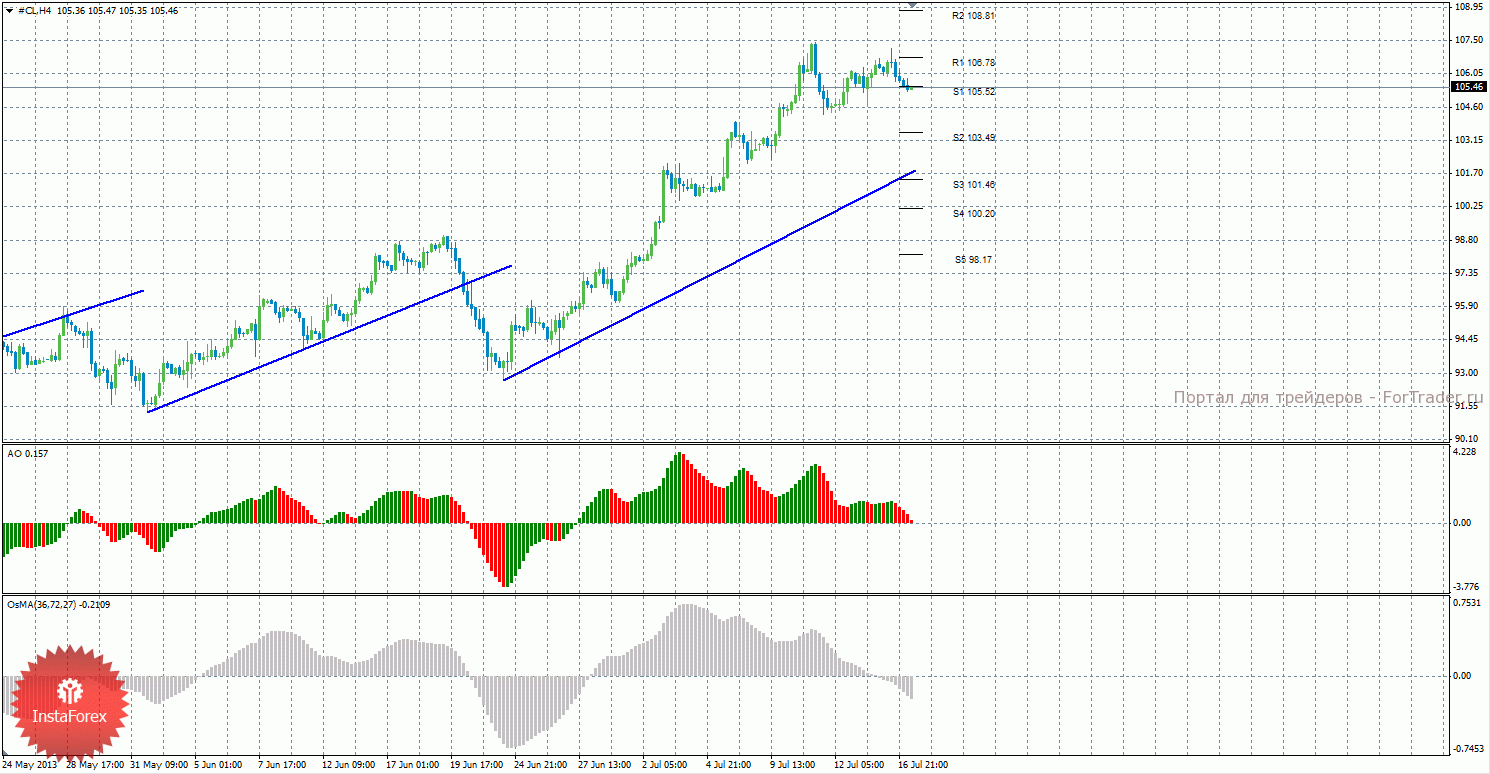 Анализ сырой нефти за 17 июля показывает, что цена начала очередную локальную коррекцию, о чем сигнализирует и Awesome, и OsMA, развернувшись вниз. Сейчас актуальны длинные позиции с целями R1 – 106,78 и R2 – 108,81, если цена отскочит от уровня 105,52. Может также продолжиться нисходящая коррекция с целями 103,49 и 101,46, если цена закрепится ниже уровня поддержки S1 – 105,52. Восходящая линия тренда продолжает оказывать поддержку торгующим на повышение, однако, она сейчас находится достаточно далеко от цены. Индикатор Awesome показывает текущее нисходящее движение, так как последний закрытый бар красного цвета. OsMA также направлен вниз, что говорит о нисходящем характере движения и в более долгосрочном плане. Если цена не преодолеет уровень 105,52, это может стать сигналом к продолжению восходящего тренда.