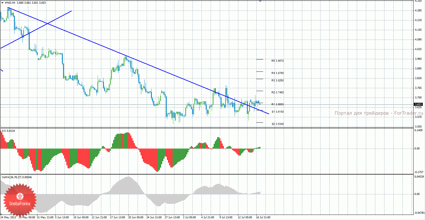 Анализ природного газа за 17 июля показывает, что цена опять закрепилась выше нисходящей линии тренда, поэтому сейчас есть вероятность смены тенденции на рынке на восходящую. Сейчас актуально движение вверх с целями уровни сопротивления R2 — 3,7460 и R3 — 3,8260. Целями для возможного витка нисходящей коррекции или для возобновления нисходящего движения выступают уровни 3,6150 и 3,5340, если цена закрепится ниже уровня поддержки 3,6650 или ниже линии тренда. Нисходящая линия тренда больше не оказывает поддержку торгующим на понижение. Индикатор Awesome показывает локальное восходящее движение, последний закрытый бар окрашен в зеленый цвет. OsMA также развернулся наверх, что сигнализирует о восходящем движении цены на газ и в более долгосрочной перспективе. Если цена закрепится ниже уровня 3,6650, это может засвидетельствовать возобновление нисходящего движения.