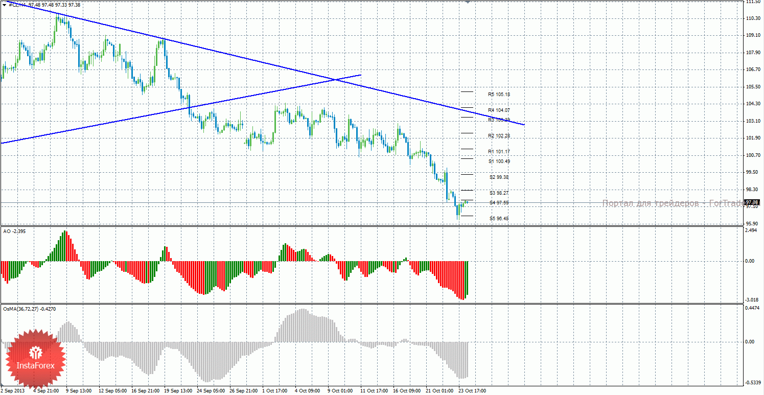 Анализ сырой нефти за 24 октября показывает, что цена не смогла преодолеть последний уровень поддержки, отскочила от него и начала коррекционное движение. Нисходящее движение может возобновиться с целью S5 – 96,48, если цена отскочит от уровня 97,59. Может продолжиться восходящая коррекция с целями 98,27 и 99,38, в случае, если цена закрепится выше уровня 97,59. Нисходящая линия тренда сейчас является актуальной и оказывает поддержку торгующим на понижение. Индикатор Awesome показывает текущее восходящее движение, так как последний закрытый бар зеленого цвета. OsMA также развернулся наверх, что говорит о восходящем характере движения и в более долгосрочном плане. Закрепление цены выше уровня 97,59 может усилить восходящее коррекционное движение.