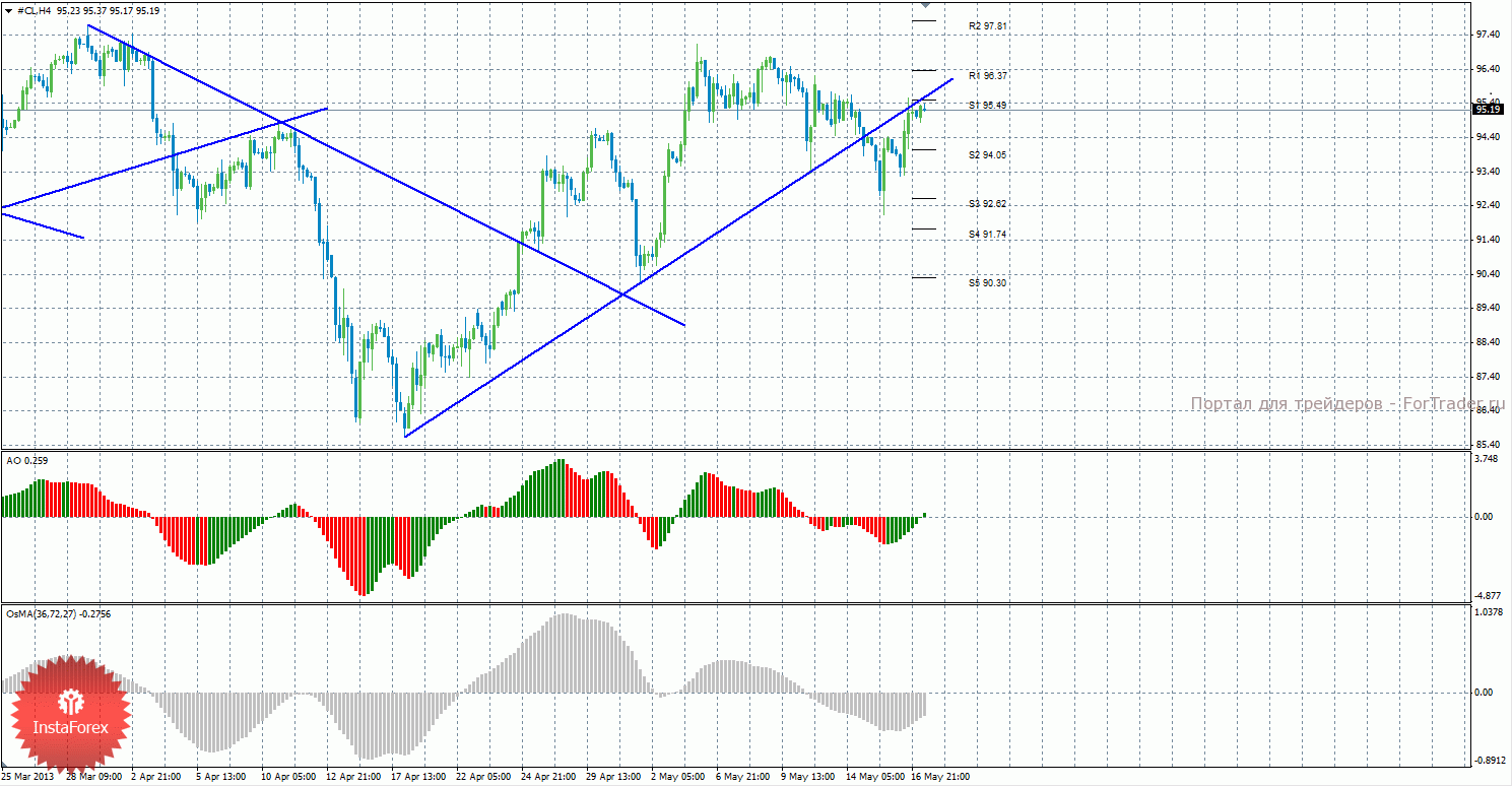Анализ сырой нефти за 17 мая показывает, что цена продолжает находиться ниже восходящей линии тренда, но при этом продолжает восходящее коррекционное движение и отработала линию тренда снизу. Восходящая линия тренда больше не поддерживает торгующих на повышение, новой нисходящей трендовой линии пока нет. Поэтому на данный момент актуальны короткие позиции с целями S2 – 94,05 и S3 – 92,62, если цена останется ниже уровня 95,49. Может также продолжиться восходящая коррекция или даже возобновиться восходящее движение с целями 96,37 и 97,81, если цена закрепится выше уровня 95,49. Индикатор Awesome показывает текущее восходящее движение, так как последний закрытый бар зеленого цвета. OsMA также направлен наверх, что говорит о восходящем характере движения и в более долгосрочном плане. Если цена закрепится выше уровня 95,49, это может спровоцировать продолжение коррекционного движения.