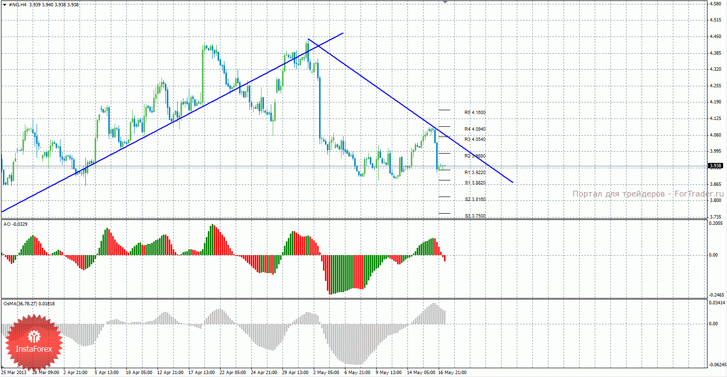 Анализ природного газа за 17 мая показывает, что цена отскочила от уровня сопротивления R4 – 4,0940 и возобновила нисходящее движение, также построена нисходящая линия тренда. Сейчас актуально нисходящее движение с целями 3,8820 и 3,8160, если цена закрепится ниже уровня R1 – 3,9220. Целями для возможного возобновления восходящей коррекции выступают уровни 3,9880 и 4,0540, если цена отскочит от уровня 3,9220. Восходящая линия тренда больше не оказывает поддержку быкам, но построена новая нисходящая линия тренда, которая поддерживает уже нисходящее движение. Индикатор Awesome показывает локальное нисходящее движение, последний закрытый бар окрашен в красный цвет. OsMA также направлен вниз, что сигнализирует о нисходящем движении цены на газ и в более долгосрочной перспективе. Отскок цены от уровня 3,9220 может спровоцировать новый виток коррекции.