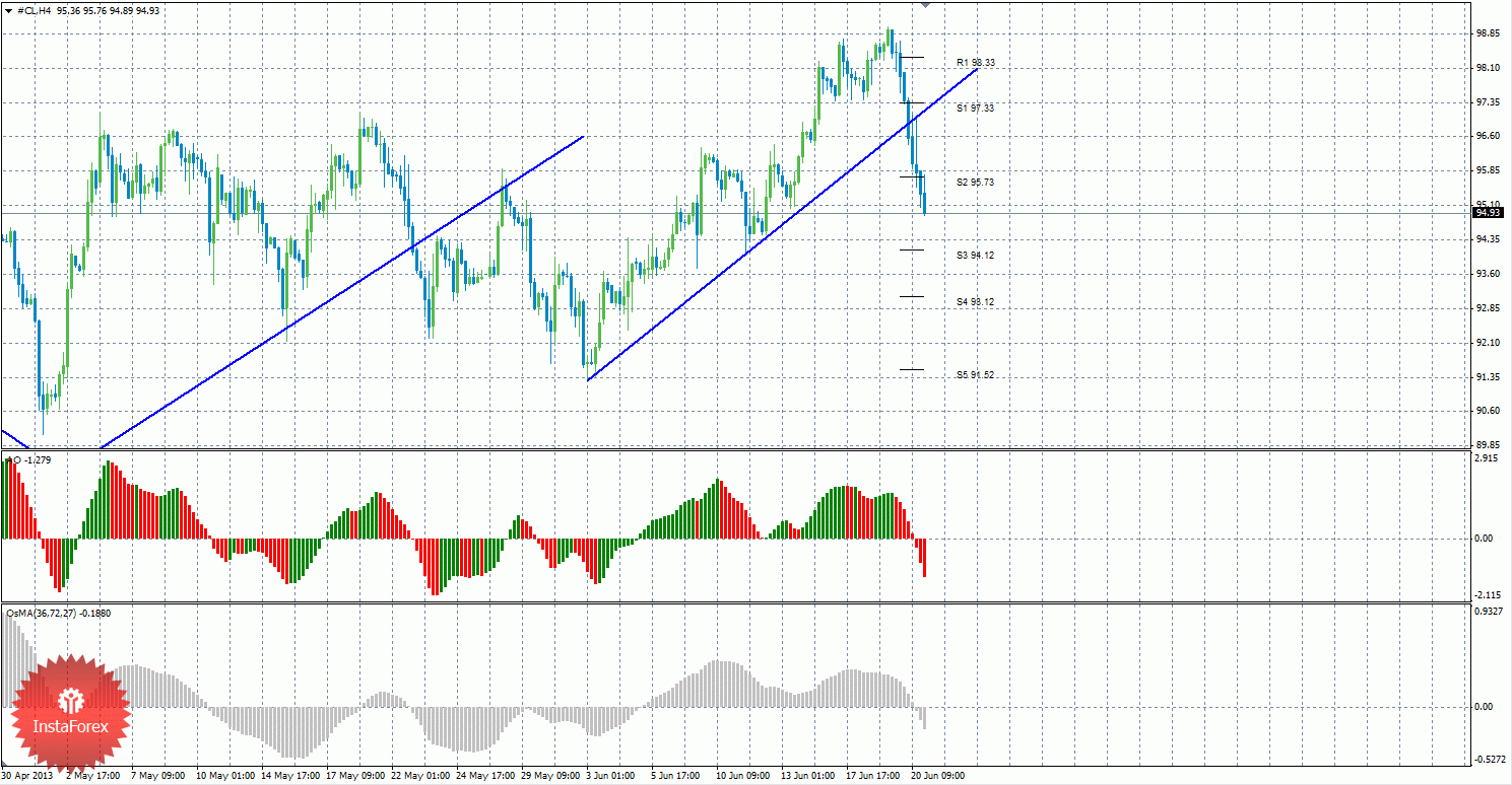 Анализ сырой нефти за 21 июня показывает, что цена закрепилась ниже восходящей линии тренда и продолжает нисходящее движение, преодолевая один уровень поддержки за другим. Сейчас актуальны короткие позиции с целями S3 – 94,12 и S4 – 93,12. Может начаться виток восходящего движения с целями 95,73 и 97,33, если цена отскочит от уровня 94,12. Восходящая линия тренда больше не поддерживает торгующих на повышение, так как цена закрепилась ниже нее. Индикатор Awesome показывает текущее нисходящее движение, так как последний закрытый бар красного цвета. OsMA также направлен вниз, что говорит о нисходящем характере движения и в более долгосрочном плане. Если цена отскочит от уровня S3 – 94,12, это может спровоцировать восходящее коррекционное движение.