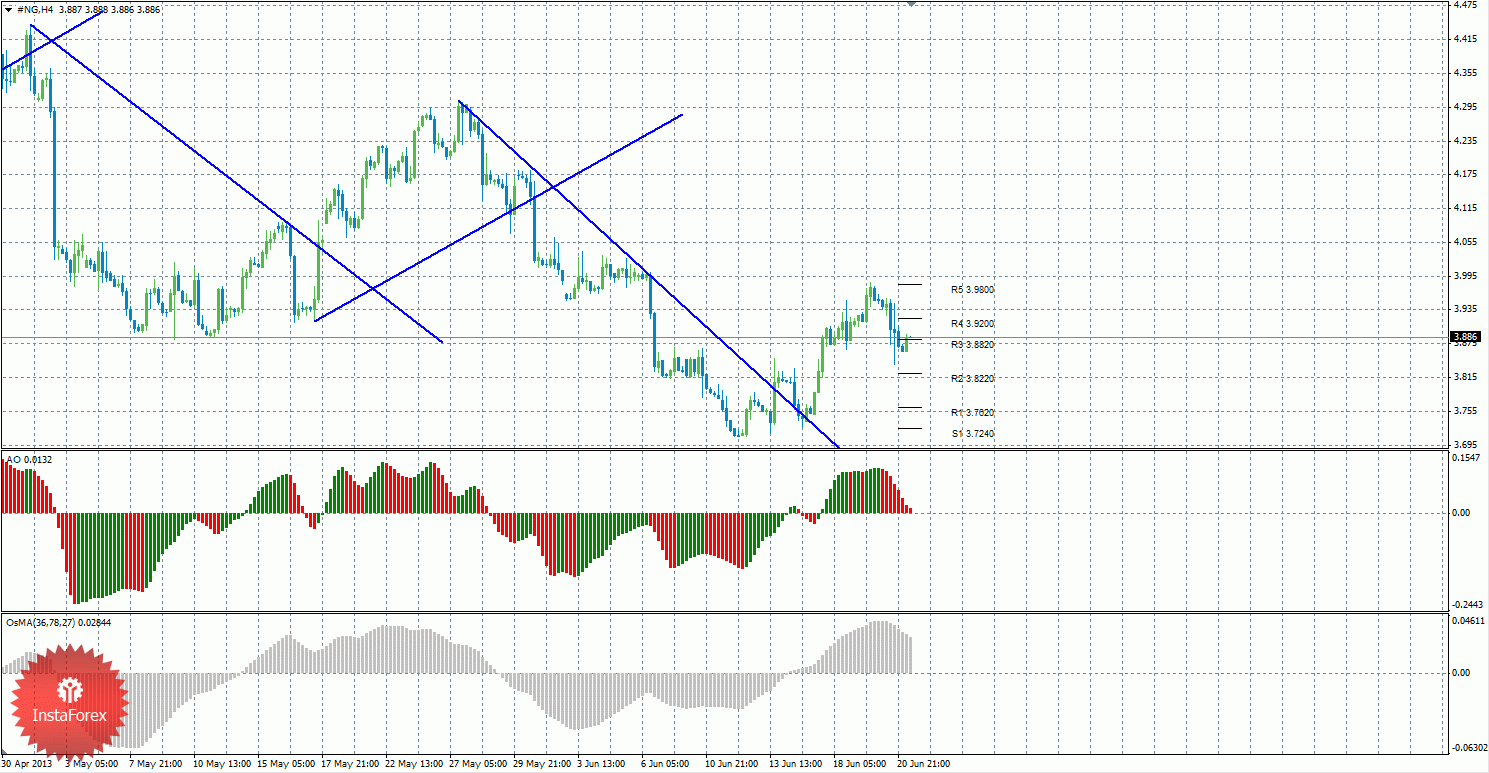 Анализ природного газа за 21 июня показывает то, что цена по-прежнему находится выше нисходящей линии тренда, отработала уровень сопротивления 3,9800 и отскочила от него, начав нисходящую коррекцию. Сейчас поэтому актуально движение вверх с целями уровни сопротивления 3,9200 и 3,9800, если цена закрепится выше уровня 3,8820. Целями для возможного продолжения нисходящей коррекции выступают уровни 3,8220 и 3,7620, если цена останется ниже уровня R3 — 3,8820. Нисходящая линия тренда больше не оказывает поддержку торгующим на понижение, так как цена закрепилась выше нее. Новую восходящую линию тренда построить пока что нельзя. Индикатор Awesome показывает локальное нисходящее движение, последний закрытый бар окрашен в красный цвет. OsMA также развернулся вниз, что сигнализирует о нисходящем движении цены на газ и в более долгосрочной перспективе. Если цена закрепится выше уровня 3,8820, это может стать сигналом к возобновлению восходящего движения.