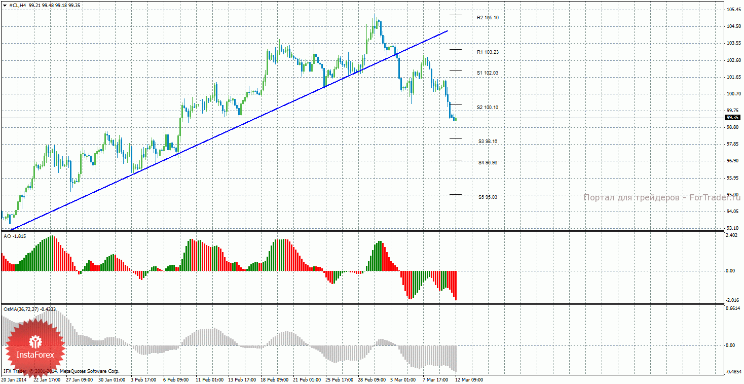 Анализ сырой нефти за 12 марта показывает, что цена продолжает нисходящее движение и преодолела уровень поддержки S2 — 100,10. Нисходящее движение может продолжиться с целями S3 – 98,16 и S4 – 96,96, если цена останется ниже уровня 100,10. Может начаться восходящая коррекция с целями 102,03 и 103,23, в случае, если цена закрепится выше уровня 100,10. Восходящая линия тренда больше не оказывает поддержку торгующим на повышение, цена располагается ниже нее, поэтому сейчас стали актуальными короткие позиции. Индикатор Awesome показывает текущее нисходящее движение, так как последний закрытый бар красного цвета. OsMA также развернулся вниз, что говорит о нисходящем характере движения и в более долгосрочном плане. Отскок от уровня 98,16 может спровоцировать виток восходящей коррекции.