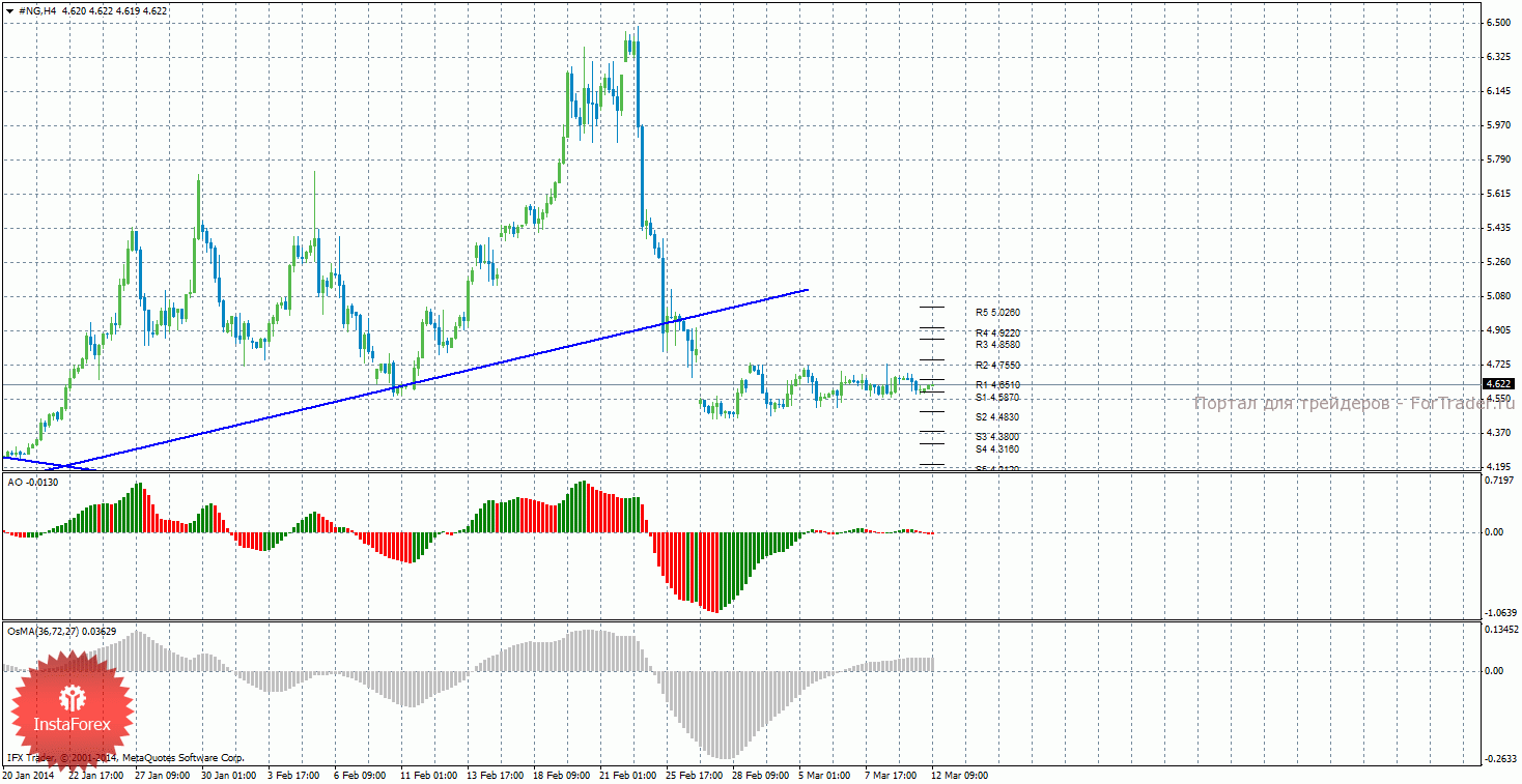 Анализ природного газа за 12 марта показывает, что цена продолжает находиться между уровнями S1 и R1, боковое движение продолжается. На данный момент актуально нисходящее движение с целями уровни поддержки S2 – 4,4830 и S3 – 4,3800, если цена закрепится ниже уровня 4,5870. Целями для возможной восходящей коррекции выступают уровни сопротивления 4,6510 и 4,7550, если цена останется выше уровня 4,5870. Цена закрепилась ниже восходящей линии тренда, поэтому она более не актуальна, тенденция на рынке поменялась на нисходящую. Нисходящей линии тренда пока что нет. Индикатор Awesome показывает локальное нисходящее движение, последний закрытый бар окрашен в красный цвет. OsMA же направлен вверх, что сигнализирует о восходящем движении цены на газ в более долгосрочной перспективе. Сейчас на рынке полный флэт.
