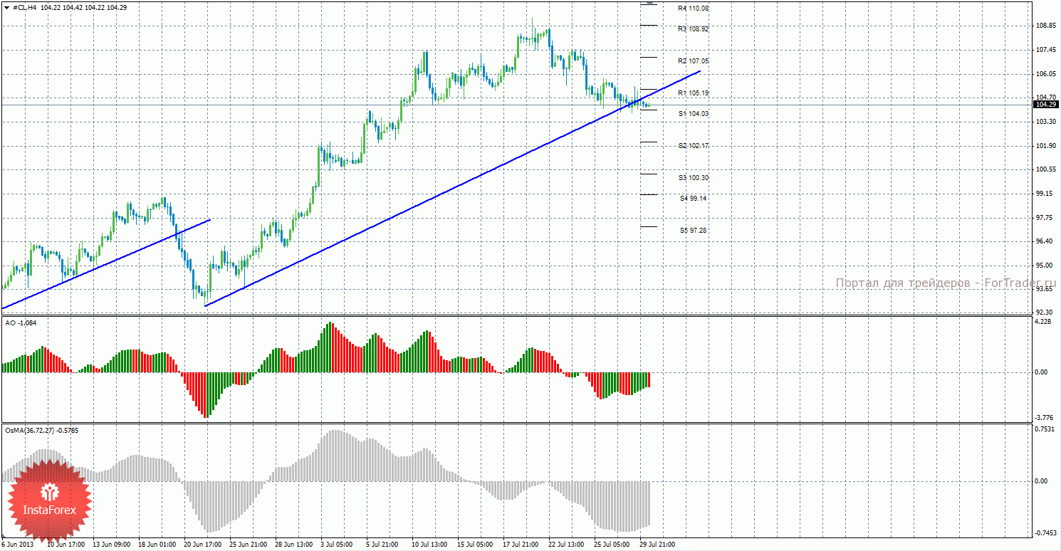 Анализ сырой нефти за 30 июля показывает, что цена продолжает нисходящее коррекционное движение и отработала восходящую линию тренда, ниже которой даже закрепилась, но закрепление какое-то неуверенное. Поэтому сейчас актуальны длинные позиции с целями R2 – 107,05 и R3 – 108,92, если цена не закрепится ниже уровня 104,03. Может также продолжиться нисходящее движение с целями 102,17 и 100,30, если цена преодолеет уровень 104,03, в этом случае станут актуальными короткие позиции. Восходящая линия тренда продолжает пока что оказывать поддержку торгующим на повышение, если цена ее преодолеет более уверенно, то тенденция на рынке может поменяться на нисходящую и станут актуальным короткие позиции. Индикатор Awesome показывает текущее восходящее движение, так как последний закрытый бар зеленого цвета. OsMA также развернулся наверх, что говорит о восходящем характере движения и в более долгосрочном плане. Если цена не преодолеет линию тренда, это может спровоцировать возобновление восходящего движения. Оба индикатора начали разряжаться, так как цена не повышается.