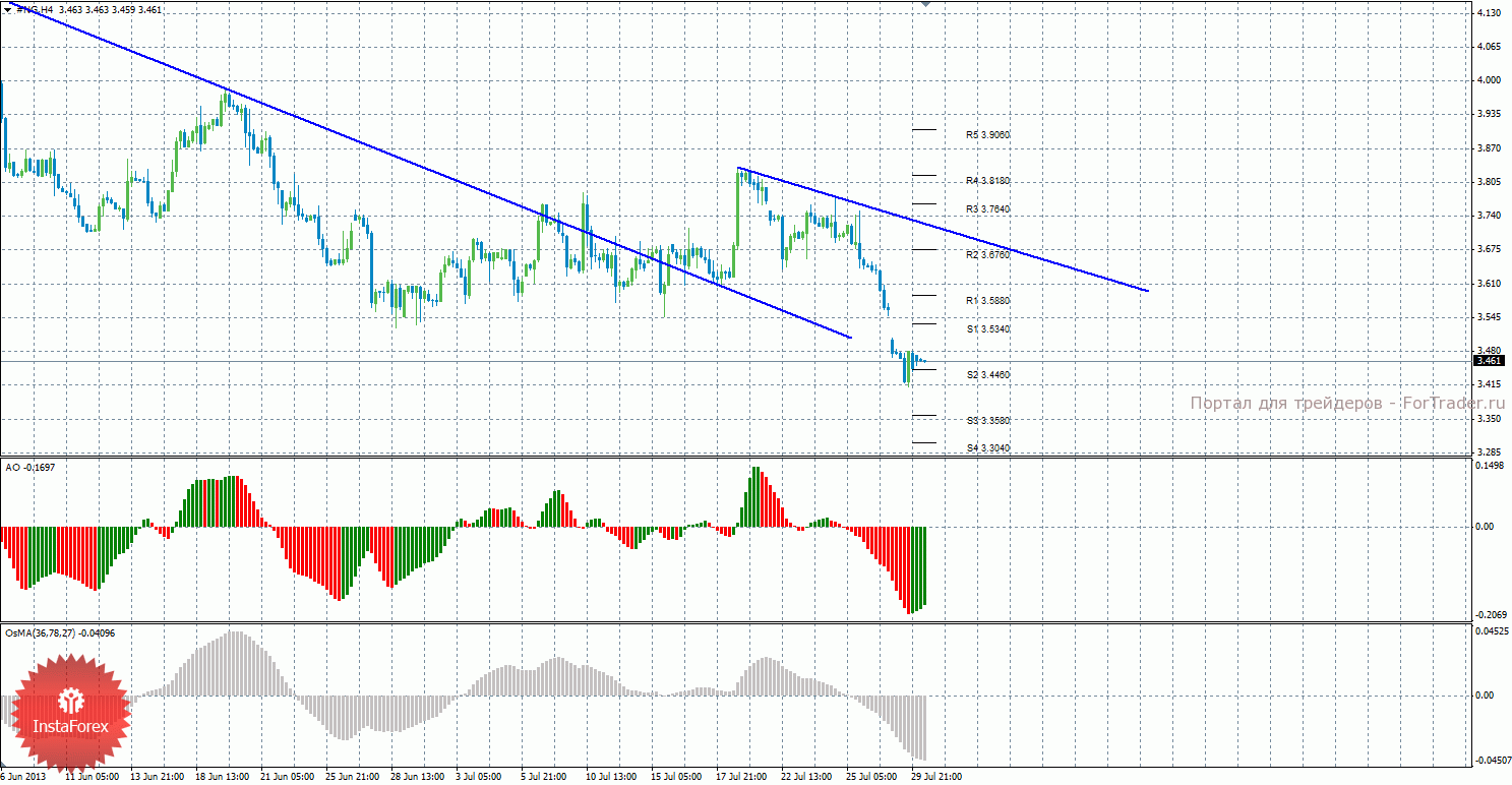 Анализ природного газа за 30 июля показывает, что цена продолжает нисходящее движение, построена новая нисходящая линия тренда, которая оказывает поддержку торгующим на понижение. Сейчас актуально движение вниз с целями уровни поддержки S2 — 3,4460 и S3 — 3,3580, первый из которых уже отработан. Целью для возможного начала восходящей коррекции выступают уровни 3,5340 и 3,5880, если цена отскочит от 3,4460. Новая нисходящая линия тренда оказывает поддержку торгующим на понижение. Индикатор Awesome показывает локальное восходящее движение, последний закрытый бар окрашен в зеленый цвет. OsMA же пока что направлен вниз, что сигнализирует о нисходящем движении цены на газ в более долгосрочной перспективе. Если цена отскочит от уровня 3,4460, может начаться виток восходящей коррекции.