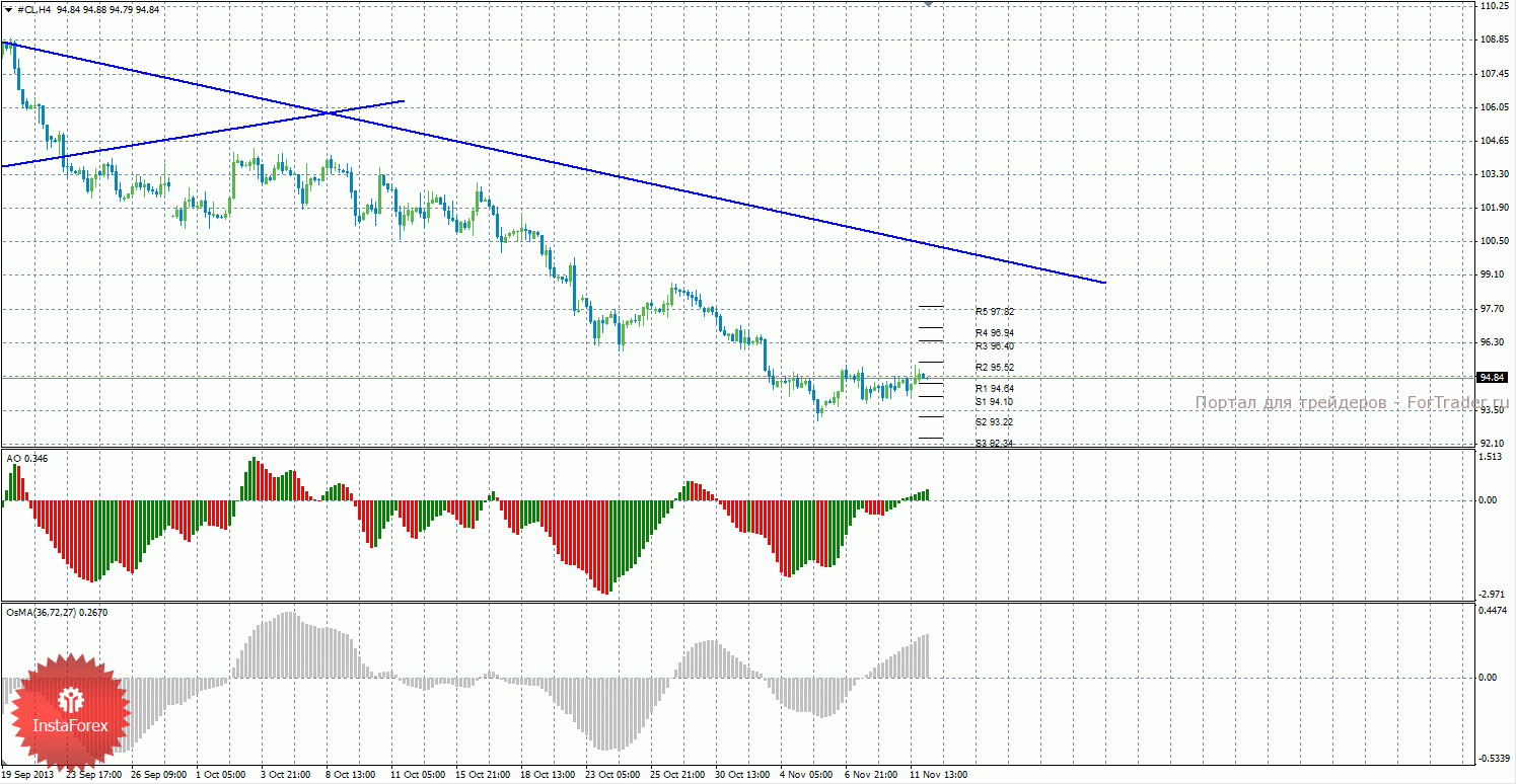 Анализ сырой нефти за 12 ноября показывает, что цена продолжает слабое коррекционное движение и закрепилась выше уровня сопротивления R1. Нисходящее движение может продолжиться с целями S1 – 94,10 и S2 – 93,22, если цена закрепится ниже уровня 94,64. Может продолжиться восходящая коррекция с целями 95,52 и 96,40, в случае, если цена останется выше уровня 94,64. Нисходящая линия тренда сейчас является актуальной и оказывает поддержку торгующим на понижение, но цена находится довольно далеко от нее. Индикатор Awesome показывает текущее восходящее движение, так как последний закрытый бар зеленого цвета. OsMA также направлен наверх, что говорит о восходящем характере движения и в более долгосрочном плане. Закрепление цены ниже уровня 94,64 может спровоцировать завершение витка восходящей коррекции.