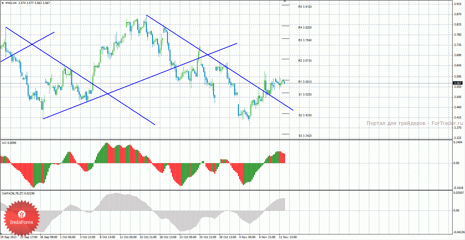 Анализ природного газа за 12 ноября показывает, что цена продолжает восходящее движение после того, как закрепилась выше линии тренда, но выше уровня сопротивления R1 закрепиться не может. На данный момент актуально восходящее движение с целями уровни сопротивления R2 — 3,6730 и R3 – 3,7640, если цена закрепится выше уровня 3,5810. Целями для возможного витка коррекционного движения выступают уровни поддержки 3,5250 и 3,4330, если цена отскочит от уровня 3,5810. Нисходящая линия тренда больше не поддерживает торгующих на понижение, новой восходящей линии тренда пока что нет. Индикатор Awesome показывает локальное нисходящее движение, последний закрытый бар окрашен в красный цвет. OsMA же направлен наверх, что сигнализирует о восходящем движении цены на газ в более долгосрочной перспективе. Отскок цены от уровня 3,5810 может спровоцировать нисходящую коррекцию.