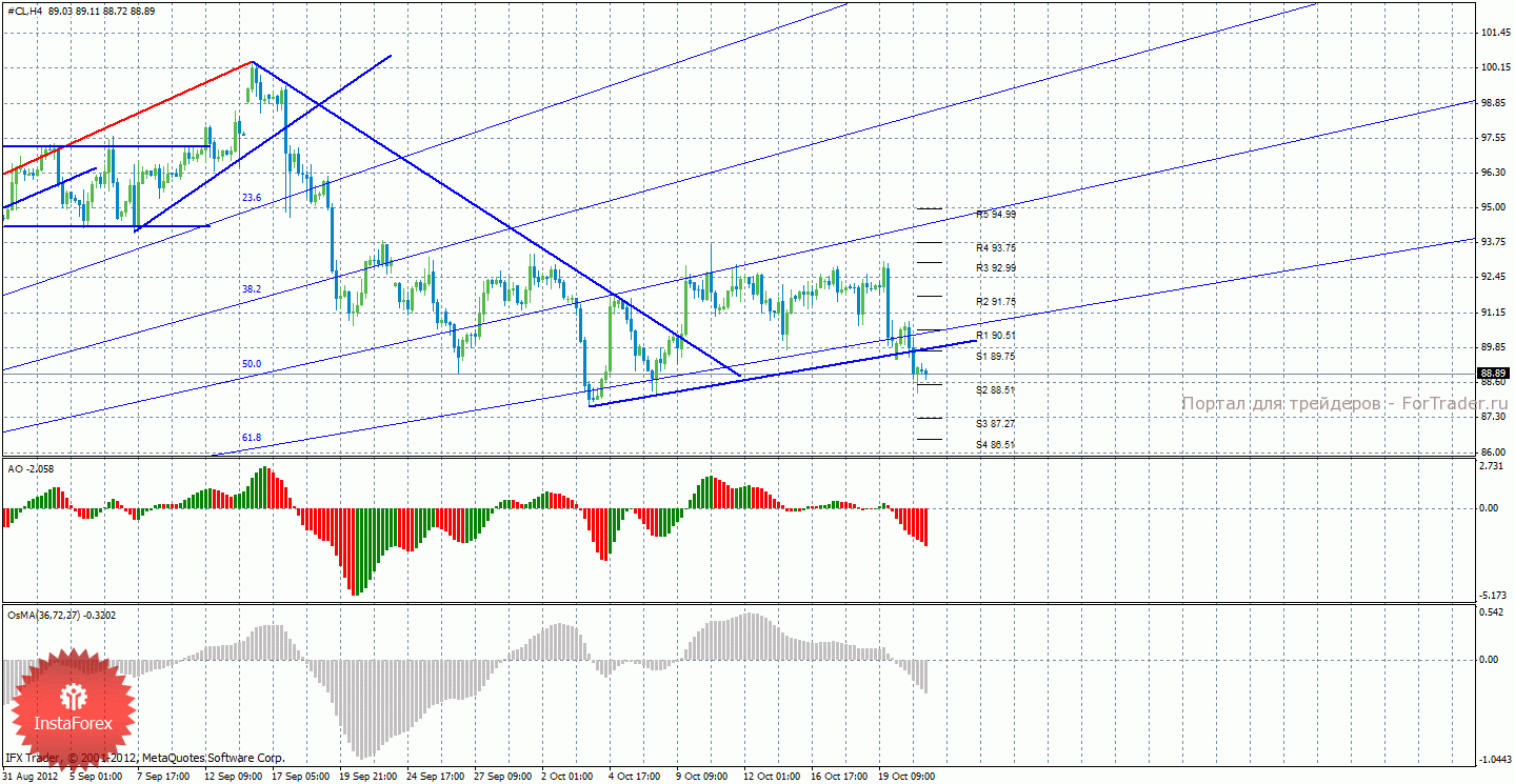 Анализ сырой нефти за 23 октября показывает, что цена вновь закрепилась ниже перестроенной восходящей линии тренда, чем окончательно запутала всю ситуацию на рынке. Нисходящая линия тренда более не актуальна, так как цена закрепилась выше нее и точно также не актуальна сейчас и восходящая линия тренда, ниже которой закрепилась цена. С точки зрения закрепления цены ниже линии тренда сейчас актуальны короткие позиции, но из-за частых коррекций и смен тенденций рекомендуется не использовать этот инструмент до стабилизации ситуации. Индикатор Awesome показывает текущее нисходящее движение, так как последний закрытый бар красного цвета. OsMA также развернулся вниз, что говорит о нисходящем характере движения и в более долгосрочном плане.