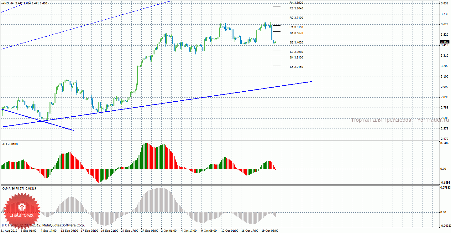 Анализ природного газа за 23 октября показывает то, что цена сохраняет перспективы восходящего движения, но при этом начала новую коррекцию. Целями для продолжения восходящего движения сейчас выступают 3,5570 и 3,6150, но для этого требуется закрепление цены выше 3,4620. Нахождение цены ниже уровня 3,4620 сигнализирует о коррекции с целями 3,3680 и 3,3100. Восходящая линия тренда поддерживает торгующих на повышение, но у нее достаточно малый угол наклона и цена довольно далеко от нее находится, хотя и слабой ее назвать нельзя. Индикатор Awesome показывает локальное нисходящее движение, последний закрытый бар окрашен в красный цвет, что сигнализирует о продолжении нисходящего движения. OsMA также развернулся вниз, что сигнализирует о нисходящем движении цены на газ и в более долгосрочной перспективе.
