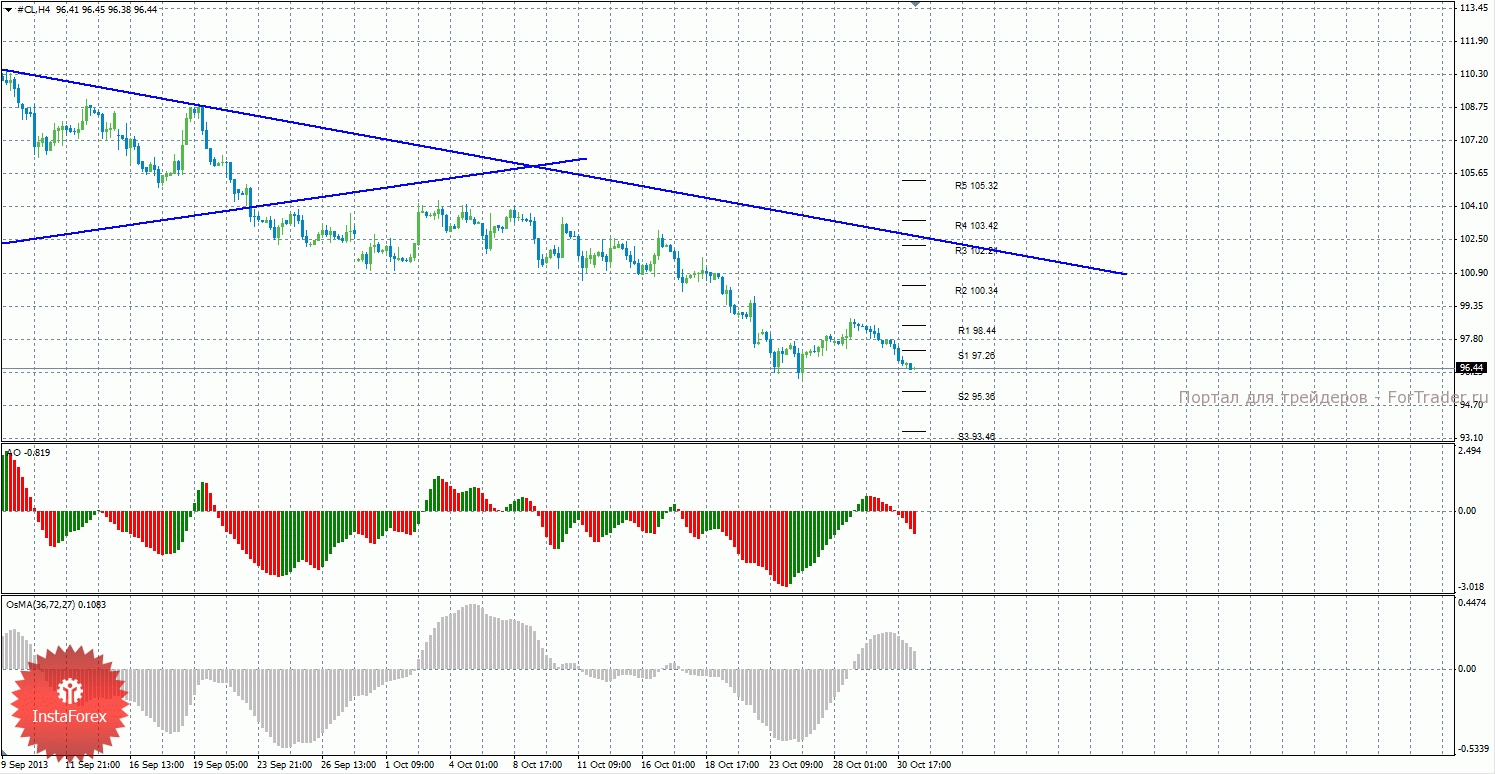 Анализ сырой нефти за 31 октября показывает, что цена возобновила нисходящее движение и закрепилась ниже уровня поддержки 97,26, оба индикатора направлены вниз. Нисходящее движение может возобновиться с целями S2 – 95,36 и S3 – 93,46, если цена останется ниже уровня 97,26. Может начаться новая восходящая коррекция с целями 98,44 и 100,34, в случае если цена закрепится выше уровня 97,26. Нисходящая линия тренда сейчас является актуальной и оказывает поддержку торгующим на понижение. Индикатор Awesome показывает текущее нисходящее движение, так как последний закрытый бар красного цвета. OsMA также направлен вниз, что говорит о нисходящем характере движения и в более долгосрочном плане. Закрепление цены выше уровня 97,26 может спровоцировать начало коррекционного движения.