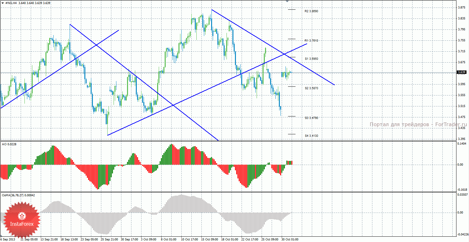 Анализ природного газа за 31 октября показывает, что цена продолжает коррекцию и располагается выше уровня S2 – 3,5870, оба индикатора развернулись наверх. На данный момент актуально нисходящее движение с целями уровни поддержки S3 — 3,4790 и S4 – 3,4130, если цена закрепится ниже уровня 3,5870. Целью для возможного продолжения витка восходящей коррекции выступают уровни 3,6950 и 3,7610, если цена останется выше уровня 3,5870. Восходящая линия тренда больше не актуальна, так как цена преодолела ее, построена нисходящая линия тренда, поддерживающая торгующих на понижение. Индикатор Awesome показывает локальное восходящее движение, последний закрытый бар окрашен в зеленый цвет. OsMA также направлен наверх, что сигнализирует о восходящем движении цены на газ и в более долгосрочной перспективе. Закрепление цены ниже уровня 3,5870 может спровоцировать завершение коррекции.