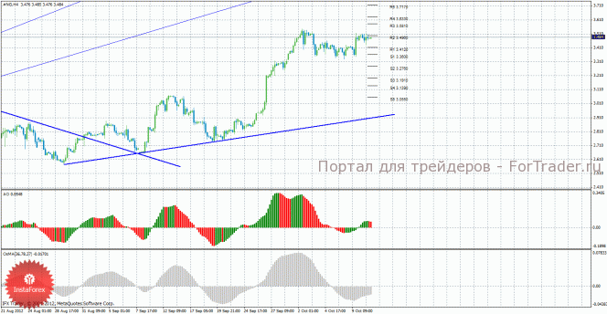 Анализ природного газа за 11 октября показывает, что цена возобновила восходящее движение, о чем говорит разворот индикаторов наверх, но вчерашние торги прошли довольно вяло. Целями для продолжения восходящего движения сейчас выступают 3,5810 и 3,6330, но для этого требуется закрепление цены выше уровня 3,4960. Отскок цены от уровня R2 – 3,4960 укажет на возможное начало коррекции с целями 3,4120 и 3,3600. Новая восходящая линия тренда поддерживает торгующих на повышение, но у нее достаточно малый угол наклона и цена довольно далеко от нее находится, хотя и слабой ее назвать нельзя. Индикатор Awesome показывает локальное нисходящее движение, последний закрытый бар окрашен в красный цвет. OsMA же направлен наверх, что сигнализирует о восходящем движении цены на газ в более долгосрочной перспективе.