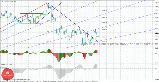 Анализ сырой нефти за 11 октября показывает, что цена закрепилась выше нисходящей линии тренда, поэтому, возможно, нисходящий тренд завершен, поэтому короткие позиции сейчас не актуальны. Нисходящая линия тренда более не актуальна, так как цена закрепилась выше нее, а значит может продолжиться уже восходящее движение. Восходящее движение может продолжиться с целями 92,72 и 94,86. Отскок цены от уровня R2 – 92,72, однако, сигнализирует о начале нисходящей коррекции с целями 90,57 и 89,25. Индикатор Awesome показывает текущее нисходящее движение, так как последний закрытый бар красного цвета, что также указывает на коррекцию. OsMA пока что направлен наверх, что говорит о восходящем характере движения в более долгосрочном плане.