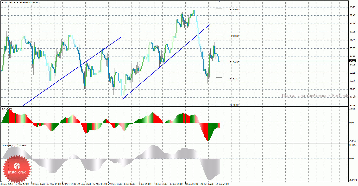 Анализ сырой нефти за 26 июня показывает, что цена завершила данный этап коррекционного движения и может возобновить нисходящее, о чем сигнализирует индикатор Awesome. Сейчас актуальны короткие позиции с целями S1 – 93,17 и S2 – 90,92, если цена закрепится ниже уровня 94,57. Может продолжиться восходящее коррекционное движение с целями 96,82 и 99,07, если цена останется выше уровня 94,57. Восходящая линия тренда больше не поддерживает торгующих на повышение, так как цена закрепилась ниже нее. Новую нисходящую линию тренда построить на данный момент нельзя. Индикатор Awesome показывает текущее нисходящее движение, так как последний закрытый бар красного цвета – нисходящее движение может возобновиться. OsMA направлен наверх, что говорит о восходящем характере движения в более долгосрочном плане. Если цена закрепится ниже уровня R1 – 94,57, это может спровоцировать возобновление нисходящего движения.