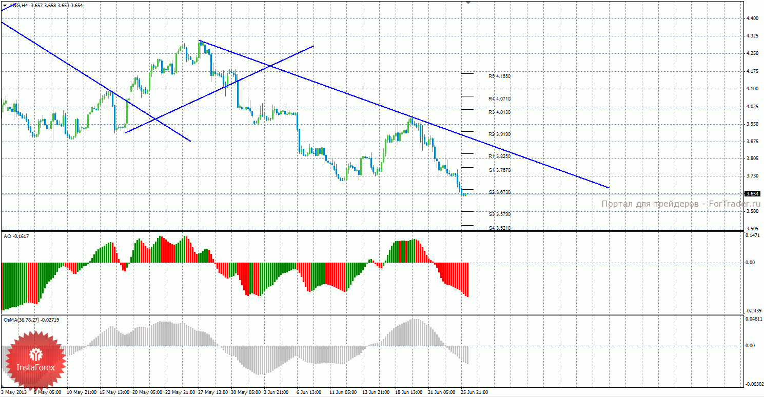 Анализ природного газа за 26 июня показывает, что нисходящая линия тренда перестроена, а цена продолжает нисходящее движение и преодолела уровень поддержки S2. Сейчас поэтому актуально движение вниз с целями уровни поддержки S3 — 3,5790 и S4 — 3,5210. Целями для возможного начала восходящего коррекционного движения выступают уровни 3,7670 и 3,8250, если цена закрепится выше уровня S2 — 3,6730. Нисходящая линия тренда вновь оказывает поддержку торгующим на понижение, так как она перестроена. Индикатор Awesome показывает локальное нисходящее движение, последний закрытый бар окрашен в красный цвет. OsMA также направлен вниз, что сигнализирует о нисходящем движении цены на газ и в более долгосрочной перспективе. Если цена закрепится выше уровня 3,7670, это может стать сигналом к началу восходящей коррекции.