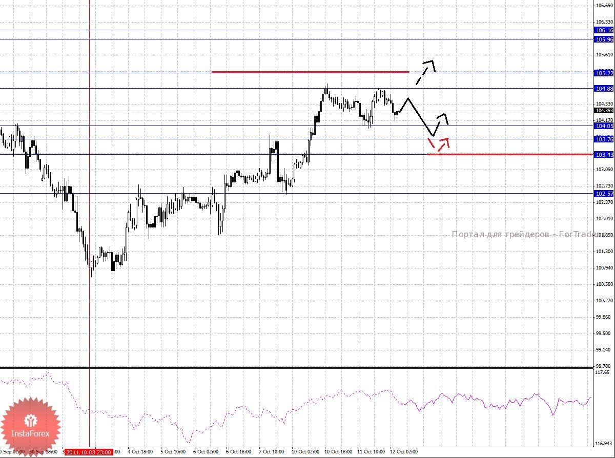 По паре Евро/Йена ключевыми уровнями являются: 106.16, 105.96, 105.22, 104.88, 104.05, 103.76, 103.43 и 102.57. Здесь мы продолжаем следить за развитием восходящего цикла от 3 октября. Краткосрочное движение к верху, ожидаем в диапазоне 104.88 – 105.22, пробой последнего значения продолжит развитие восходящей структуры, в данном случае потенциальная цель 105.96. Диапазон 105.96 – 106.16 шумовой. Корректировочное нисходящее движение, возможно в коридоре 104.05 – 103.76, пробой последнего значения приведет к углубленному движению, здесь цель 103.43, от этого уровня мы ожидаем разворот к верху. Уровень 102.57 является ключевой поддержкой для верха и интересен с точки зрения среднесрочной перспективы.
