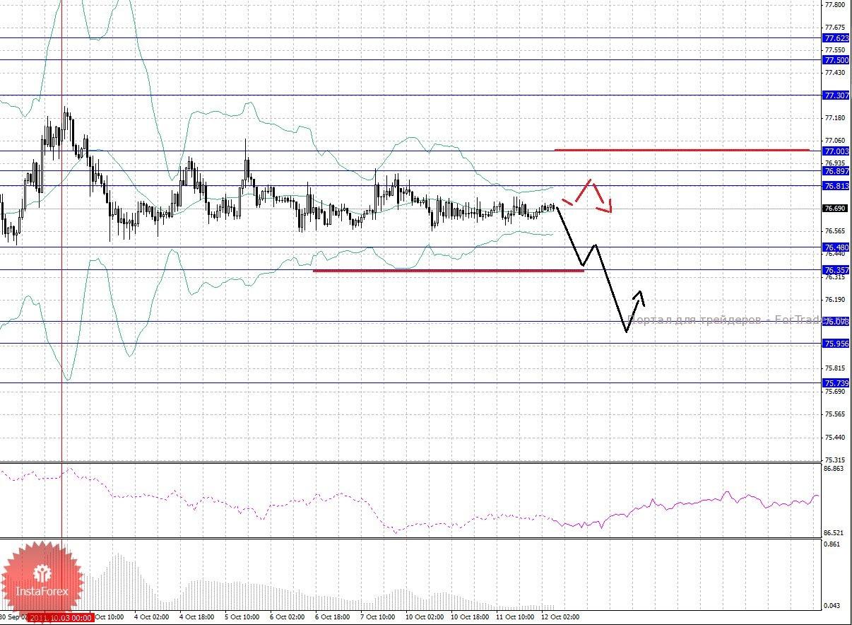 По паре Доллар/Йена ключевыми уровнями являются: 77.62, 77.50, 77.30, 77.00, 76.89, 76.81, 76.48, 76.35, 76.07, 75.95 и 75.73. Здесь ключевые уровни остались без изменения. Диапазон 76.48 – 76.35 является ключевой поддержкой для восходящей структуры от 23 сентября, в нем мы ожидаем краткосрочное нисходящее движение, пробой уровня 76.35 должен сопровождаться выраженным нисходящим движением к уровню 76.07. В коридоре 76.07 – 75.95 консолидация. Потенциальным значением для низа, считаем уровень 75.73, по достижении которого, ожидаем откат к верху. Корректировочное восходящее движение, возможно в диапазоне 76.81 – 76.89, пробой последнего значения приведет к углубленному движению, здесь цель 77.00, пробой которого, в свою очередь, будет располагать к развитию восходящей структуры, в данном случае первая цель 77.30.