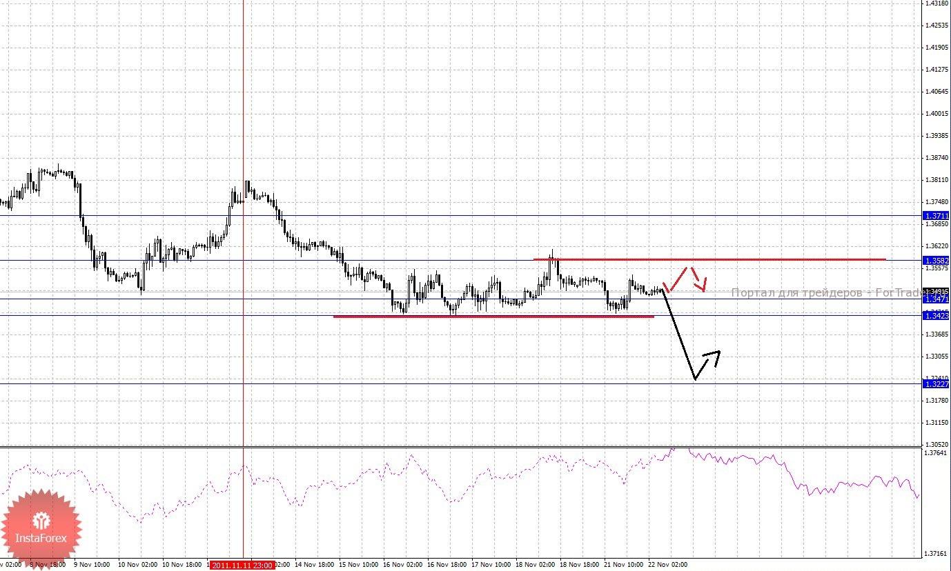 По паре Евро/Доллар важными уровнями являются: 1.3711, 1.3582, 1.3471, 1.3423 и 1.3227. Здесь ключевые цели пока остаются без изменения, однако необходимо отметить, что на текущий момент цена зашла в горизонтальный коридор, что ослабевает влияние начальных условий от 11 ноября на последующее развитие структуры. В диапазоне 1.3471 – 1.3423 мы ожидаем консолидированное движение, пробой уровня 1.3423 продолжит развитие нисходящей тенденции, в данном случае потенциальная цель 1.3227, по достижении этого уровня, ожидаем консолидацию. Уровень 1.3582 является ключевой поддержкой для низа, его пробой будет располагать к формированию восходящей структуры, здесь потенциальная цель 1.3711. До уровня 1.3711 мы ожидаем оформления начальных условий для восходящего цикла.