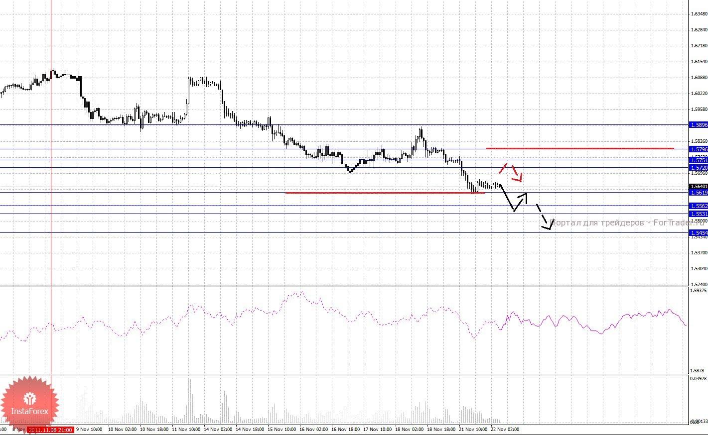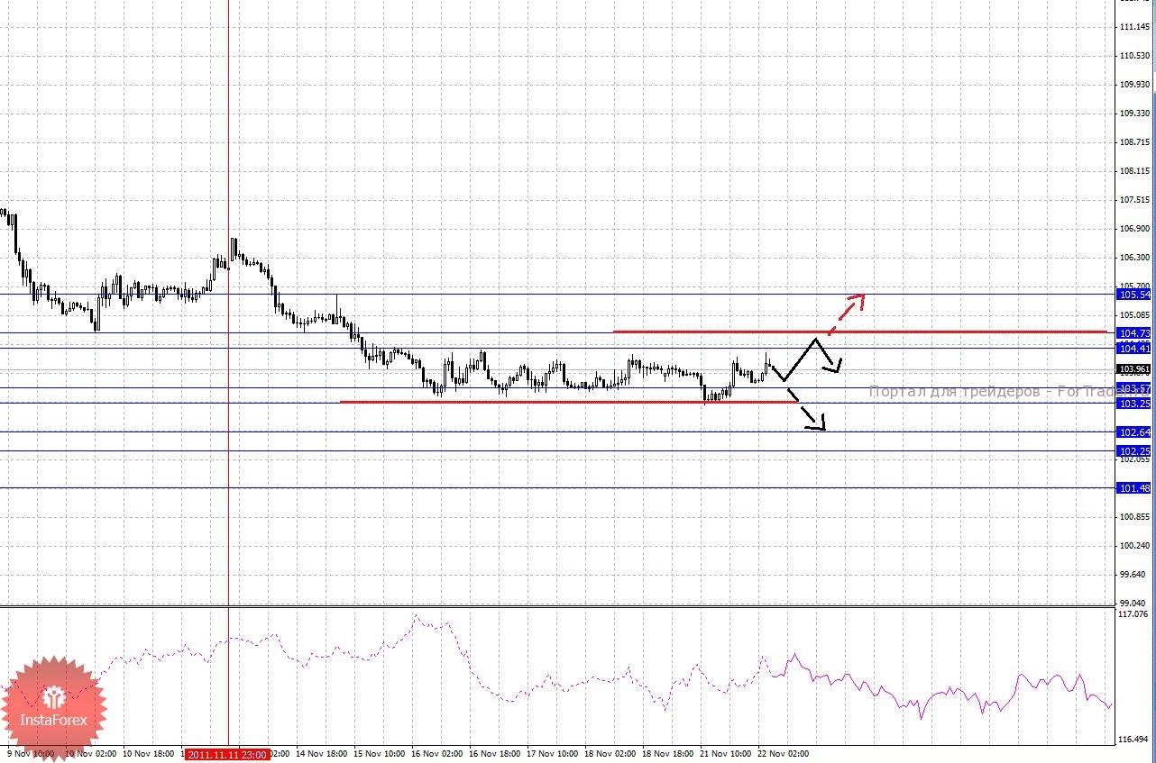 По паре Евро/Йена ключевыми уровнями являются: 105.54, 104.73, 104.41, 103.57, 103.25, 102.64, 102.25 и 101.48. Здесь ситуация аналогична паре Евро/Доллар и чем дольше цена будет находиться в коридоре 103.25 – 104.41, тем все более высока вероятность отмены нисходящей структуры от 11 ноября. Продолжения движения к низу ожидаем после прохода ценой шумового диапазона 103.57 – 103.25, в данном случае цель 102.64, в коридоре 102.64 – 102.25 консолидация цены. Потенциальным значением для низа считаем уровень 101.48, движение к которому ожидаем после пробоя 102.25. Диапазон 104.41 – 104.73 является ключевой поддержкой для нисходящей структуры, в нем мы ожидаем краткосрочное восходящее движение. Пробой уровня 104.73 будет располагать к формированию начальных условий для верха, здесь потенциальная цель 105.54.