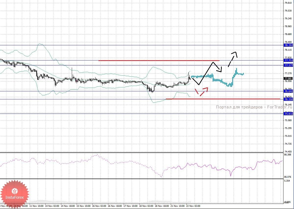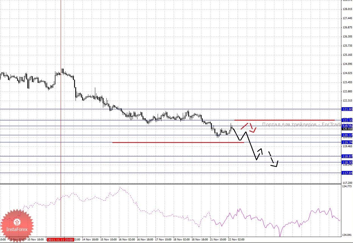 По паре Фунт/Йена ключевыми уровнями являются: 121.80, 121.10, 120.76, 120.17, 119.74, 118.87, 118.50 и 117.84. Здесь мы следим за нисходящей структурой от 11 ноября. Краткосрочное нисходящее движение ожидаем в диапазоне 120.17 – 119.74, пробой последнего значения должен сопровождаться выраженным нисходящим движением, здесь цель 118.87, в коридоре 118.87 – 118.50 консолидация цены. Потенциальным значением для низа считаем уровень 117.84, по достижении которого, ожидаем откат к верху. Корректировочное восходящее движение возможно в диапазоне 120.76 – 121.10, пробой последнего значения будет располагать к формированию восходящей структуры, в данном случае потенциальная цель – 121.80.