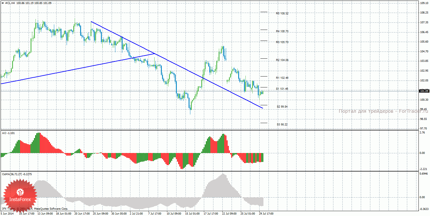 Анализ сырой нефти за 30 июля показывает, что цена продолжает коррекционное движение и закрепилась ниже уровня поддержки S1. Восходящее движение может возобновиться с целями уровни сопротивления R1 – 102,46 и R2 – 104,06, если цена закрепится выше уровня 101,46. Целями для продолжения нисходящей коррекции выступают уровни 99,84 и 98,22, если цена останется ниже уровня 101,46. Цена закрепилась выше нисходящей линии тренда, поэтому тенденция на рынке поменялась на восходящую и стали актуальными ордера на покупку. Восходящей линии тренда пока что нет. Индикатор Awesome показывает текущее восходящее движение, так как последний закрытый бар зеленого цвета. OsMA также направлен наверх, что говорит о восходящем характере движения и в более долгосрочном плане. Если цена закрепится выше уровня 101,46, это может спровоцировать возобновление восходящего движения.