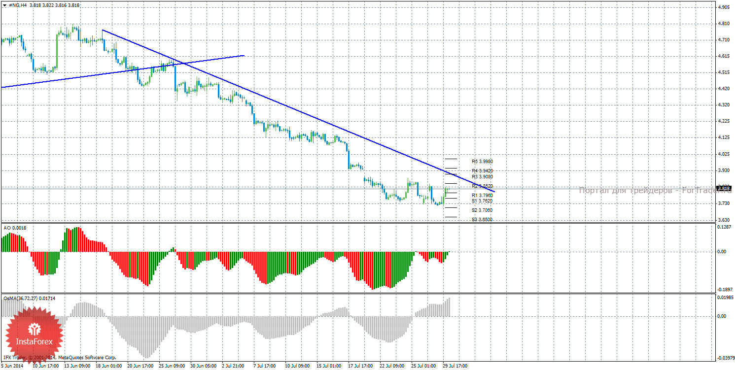 Анализ природного газа за 30 июля показывает, что цена начала новый виток коррекционного движения и закрепилась выше уровня R1. На данный момент актуально нисходящее движение с целями уровни поддержки S2 –3,7060 и S3 – 3,6500, если цена закрепится ниже уровня 3,7960. Целями для восходящей коррекции выступают уровни 3,8520 и 3,9080, если цена останется выше уровня 3,7960. Построена нисходящая линия тренда, которая оказывает поддержку торгующим на понижение и делает актуальными ордера на продажу. Индикатор Awesome показывает локальное восходящее движение, последний закрытый бар окрашен в зеленый цвет. OsMA также направлен наверх, что сигнализирует о восходящем движении цены на газ и в более долгосрочной перспективе. Отскок от линии тренда может спровоцировать завершение коррекционного движения.