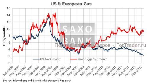 На приведенном ниже графике показано, как отклонились друг от друга цены на газ в Европе и США с 2010 года, когда начался активный рост добычи сланцевого газа, а также как обычный скачок цен в зимние месяцы в этом году полностью отсутствовал. Уже возникают вопросы о том, что будет с забитыми до отказа хранилищами, когда закончится зимнее потребление и начнется летний период пополнения запасов. Из-за слишком больших объемов запасов на рынок может хлынуть поток лишнего газа, что окажет еще большее давление на цены.