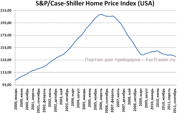 Во вторник в 12.00 по ГMT был опубликован индекс цен на недвижимость в США S&P Сase-Shiller. Цены на недвижимость в 20 американских городах в октябре снизились 6-ой месяц подряд. В месячном выражении снижение индекса цен составило 0,62%, в годовом выражении – 3,4%. Понижение cтоимости домов в ноябре в месячном выражении было зафиксировано в 19 из 20 городов. Единственными двумя городами, которые показали рост цен на недвижимость в годовом выражении, стали Вашингтон и Детройт — +1,3% и +2,5% соответственно