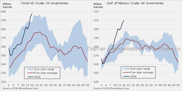 Запасы сырой нефти в США достигли рекордного значения на уровне 397,6 млн баррелей. Это самый большой объем нефти с момента начала ведения статистики Службой энергетической информации (Energy Information Administration) в 1982 году. Благодаря усовершенствованию трубопроводной инфраструктуры между регионами добычи сланцевой нефти в центральной части США и НПЗ на побережье Мексиканского залива запасы увеличились до 209,6 млн баррелей. Несмотря на то, что этот район считается крупнейшим в мире нефтеперерабатывающим узлом, если нефть продолжит поступать в таком большом количестве, то появится угроза переполненности хранилищ, что в конечном итоге либо приведет к сокращению поставок из Кушинга (крупного центра хранения и пункта поставки нефти сорта WTI), либо к уменьшению импорта, который сейчас равен 7,8 млн баррелей в сутки и приближается к среднему за 52 недели значению. Любой из сценариев развития событий негативно отразится на стоимости сырой нефти, и, если только не произойдет новая вспышка агрессии на Украине, цены на нефть подвержены падению в этом квартале.