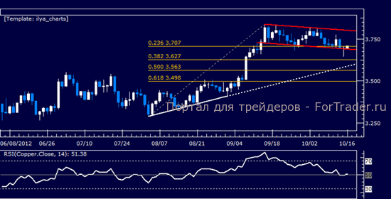 Цены прошли поддержку на отметке 3.707, 23,6% коррекция Фибоначчи, и начали тестировать дно нисходящего канала, установленного от показателей середины сентября (3.688). Прорыв вниз этой границы будет направлен в область 38,2% при 3.627. Краткосрочное сопротивление расположено на отметке 3.707 с прорывами к вершине канала в области 3.800.