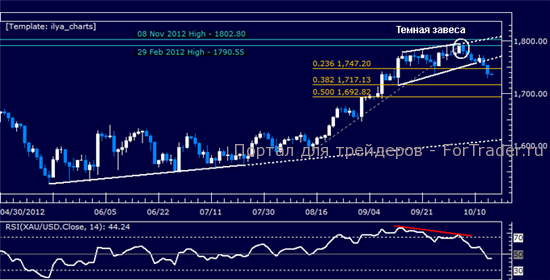Как и ожидалось после установки фигуры Темная завеса (Dark Cloud Cover) у сопротивления в области 1790.55-1802.80, цены продолжили движение вниз. Пройдя через поддержку на уровне 1747.20, 23,6% коррекция Фибоначчи, продавцы теперь целятся в отметку 38,2% уровня при 1717.13. Сопротивление было установлено в области 1747.20 с разворотом вниз, направленным на дно пройденной фигуры Восходящий клин (Rising Wedge) на уровне 1766.28.