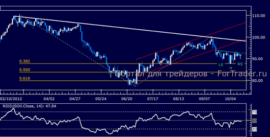 Цены тестируют сопротивление по отметке, которая станет основанием для формирования линии шеи в обратной фигуре Голова и Плечи (92.44), с прорывами вверх, направленными к области 97.90. Поддержка установлена в области 87.66, 38,2% коррекция Фибоначчи. Прорывы вниз направлены в область 50% уровня при 83.76.
