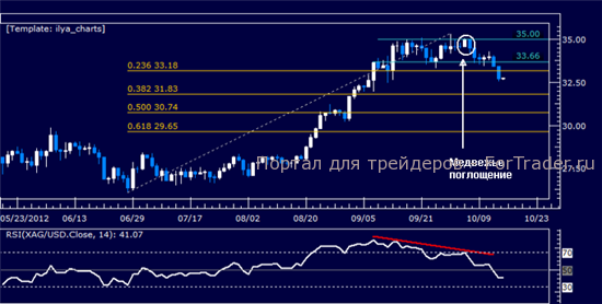 Как и ожидалось, после завершения фигуры Медвежьего поглощения (Bearish Engulfing) цены продолжили падение и опустились до отметки 35.00. Следующей целью продавцов будет поддержка на уровне 33.66 и отметка 23,6% коррекции Фибоначчи при 33.18, а также 38,2% уровень при 31.83. Сопротивление было установлено в области 33.18-66 с прорывами вверх к уровню 35.00.