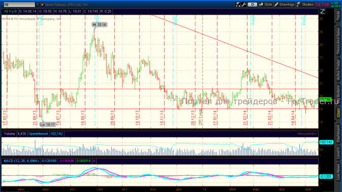 Ближайшие уровни поддержки в серебре – 19,40-18,9$, уровни сопротивления – 19,8-20,2$.