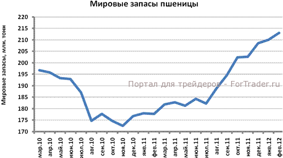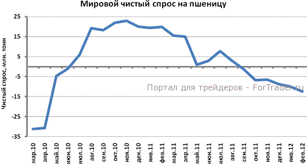 Согласно отчету, мировой чистый спрос на пшеницу в предстоящие 12 месяцев составит 680,5 млн. тонн, против прогнозных 681,4 млн. тонн в предыдущем месяце, в то время, как предложение пшеницы увеличится до 692,9 млн. тонн против ожидаемых ранее 691,5 млн. тонн.
