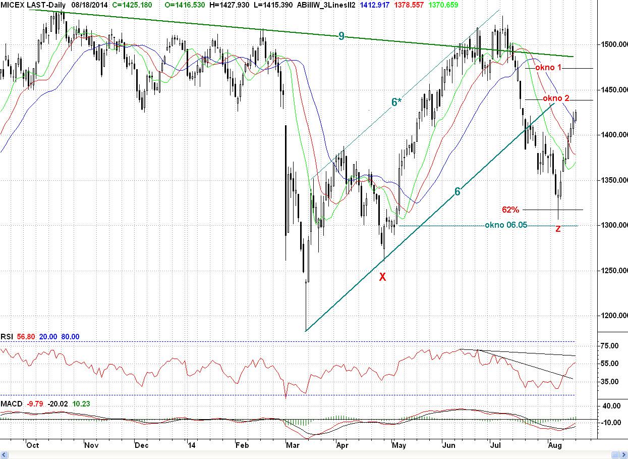 Вчера мы рекомендовали удерживать короткую позицию со стопом выше пятничного максимума (1 425,68 п.), а если он сработает, то переокрывать шорт в районе незакрытого окна №2. Полагаем, что стоп пока выстоял. Поэтому сегодня рекомендацию не изменяем. А новый стоп поставить выше уровня 62% коррекции (~1 448 п.)