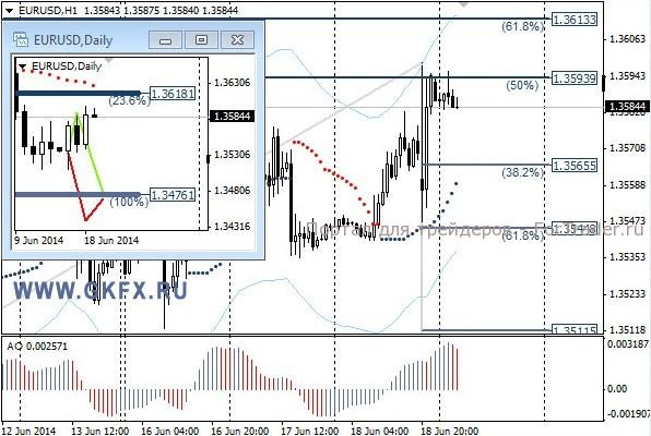Пара EURUSD выросла еще до результатов заседания ФРС США, закрыв сделку в продажи от 1,3565 по стопу +5 пунктов. Тем не менее, результаты заседания не дали возможности доллару набрать силу, а напротив, ослабили его, так как был понижен прогноз экономического роста в этом году. Зеленый сценарий нарушился и пока непонятны намеренья участников рынка. Вероятней всего рост пары продолжится в район 1,3635/50. На эту неделю традиционно рассматриваю два варианта возможного движения цены, основной красный и альтернативный зеленый. Значимые уровни на сегодня отмечены на часовом графике. Индикатор АО находится в положительной зоне и снижается, указывая на коррекцию перед возможным продолжением роста. Индикатор тренда указывает на рост. Вне рынка.