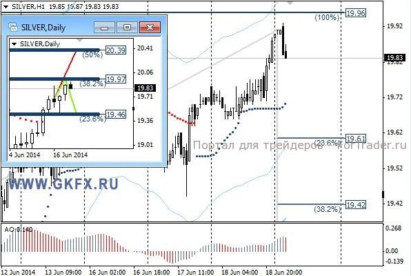 Цены на серебро продолжили рост на этой неделе, но они достигли отметки, от которой неминуем откат. Его можно наблюдать уже сутра, и он может продлиться как минимум до 19,50. По серебру пока видится так. На этот случай даю рекомендацию на продажу. Традиционно делаю два варианта движения цены на неделю, основной красный и альтернативный зеленый. Значимые уровни на сегодня отмечены на часовом графике. Индикатор АО находится в положительной зоне и снижается, указывая на коррекцию перед возможным продолжением роста. Индикатор тренда указывает на рост. Преодоление 19,80 позволит продать с целями 19,75, 19,70 и 19,55.