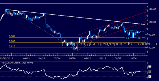Цены тестируют сопротивление по отметке, которая станет основанием для формирования линии шеи в обратной фигуре Голова и Плечи (92.38), с прорывами вверх, направленными к области 97.84. Поддержка установлена в области 87.66, 38,2% коррекция Фибоначчи. Прорывы вниз направлены в область 50% уровня при 83.76.