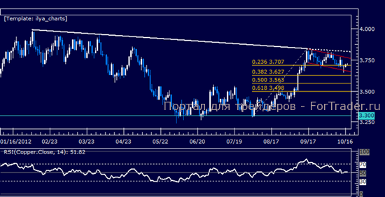 Цены прошли поддержку на отметке 3.707, 23,6% коррекция Фибоначчи, и начали тестировать дно нисходящего канала, установленного от показателей середины сентября. Разворот от указанного уровня направлен в сторону уровня 3.766 с прорывом к сопротивлению долгосрочного тренда на отметке 3.815. Разворот вниз в сторону области 3.707 открывает дорогу к дну канала на отметке 3.656 и 38,2% уровня Фибоначчи 3.627.