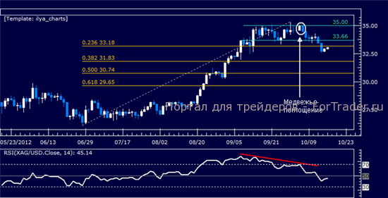 Цены провели коррекцию в сторону повышения и вернулись к тестированию сопротивления, трансформированного из поддержки, на уровне 33.18, 23,6% коррекция Фибоначчи. Уровень усилен поддержкой, установленной по дну диапазона на уровне 33.66, с прорывами к отметке 35.00 за унцию. Разворот вниз направлен в сторону поддержки на уровне 31.83, 38,2% уровня.