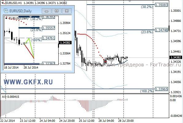 Пара EURUSD, похоже, пошла по зеленому сценарию, выполняя некоторый откат вверх. Сделку на продажу лучше прикрыть с небольшим профитом, так как есть основания полагать, что откат может продлиться до 1,3455/60. Затем, если пара поддержит мою точку зрения, она возобновит снижение. Сегодня вновь день не богат данными и динамика может иметь подобный характер. На эту неделю традиционно рассматриваю два варианта возможного движения цены, основной красный и альтернативный зеленый. Значимые уровни на сегодня отмечены на часовом графике. Индикатор АО находится в положительной зоне и снижается, указывая на коррекцию перед возможным продолжением роста. Индикатор тренда указывает на рост. Вне рынка.