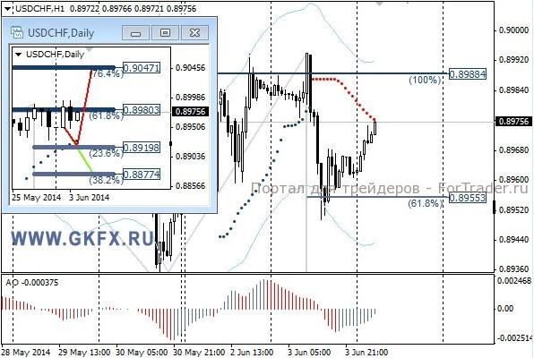 Пара USDCHF формирует расширяющуюся формацию, поэтому продолжаем стоять в стороне и наблюдать. Расширяющая формация очень неприятная, так как сложно определить, куда поставить стоп. На эту неделю традиционно рассматриваю два варианта возможного движения цены, основной красный и альтернативный зеленый. Значимые уровни на сегодня отмечены на часовом графике. Индикатор АО находится в отрицательной зоне и растет, указывая на коррекцию перед возможным продолжением снижения. Индикатор тренда указывает на снижение. Вне рынка.
