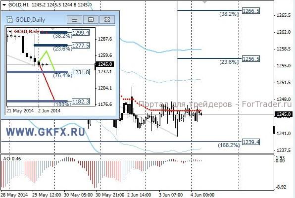 Цены на золото вновь незначительно обновили минимумы, но до второй цели цены по-прежнему не дотянули. По-прежнему ожидаю, продолжения снижения, но для страховки рекомендую передвинуть стоп на 1251,0. Традиционно делаю два варианта движения цены на неделю, основной красный и альтернативный зеленый. Значимые уровни на сегодня отмечены на часовом графике. Индикатор АО находится у нуля, указывая на неопределенность. Индикатор тренда указывает на снижение. Держим продажи от 1261,0 с целями 1240,0 и 1232,0. Стоп нужно передвинуть на 1251,0.