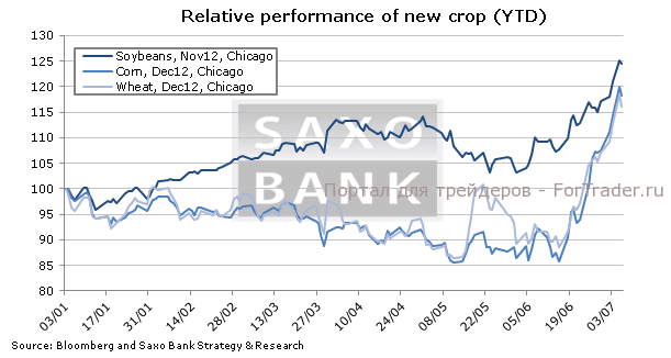 Цены на пшеницу в Европе тоже выросли, поскольку этот злак, вероятно, будет использоваться как альтернатива кукурузе, засыхающей в Штатах. Контракты на пшеницу Paris Milling за последние несколько недель выросли более чем на 20% на фоне ухудшения прогнозов по урожаю в США и ожиданий сокращения объемов экспорта из России и Украины. Международный совет по зерну понизил прогноз по объему производства пшеницы в России за год, заканчивающийся в июне 2013 года, на 6 млн. тонн до 49 млн. тонн, а в Украине — на 1 млн. тонн до 13 млн. тонн